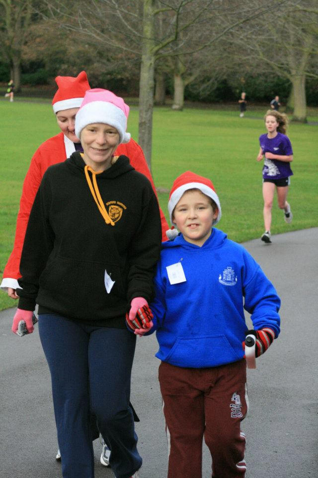 Caroline and son at the Bedford Park Christmas Eve Parkrun