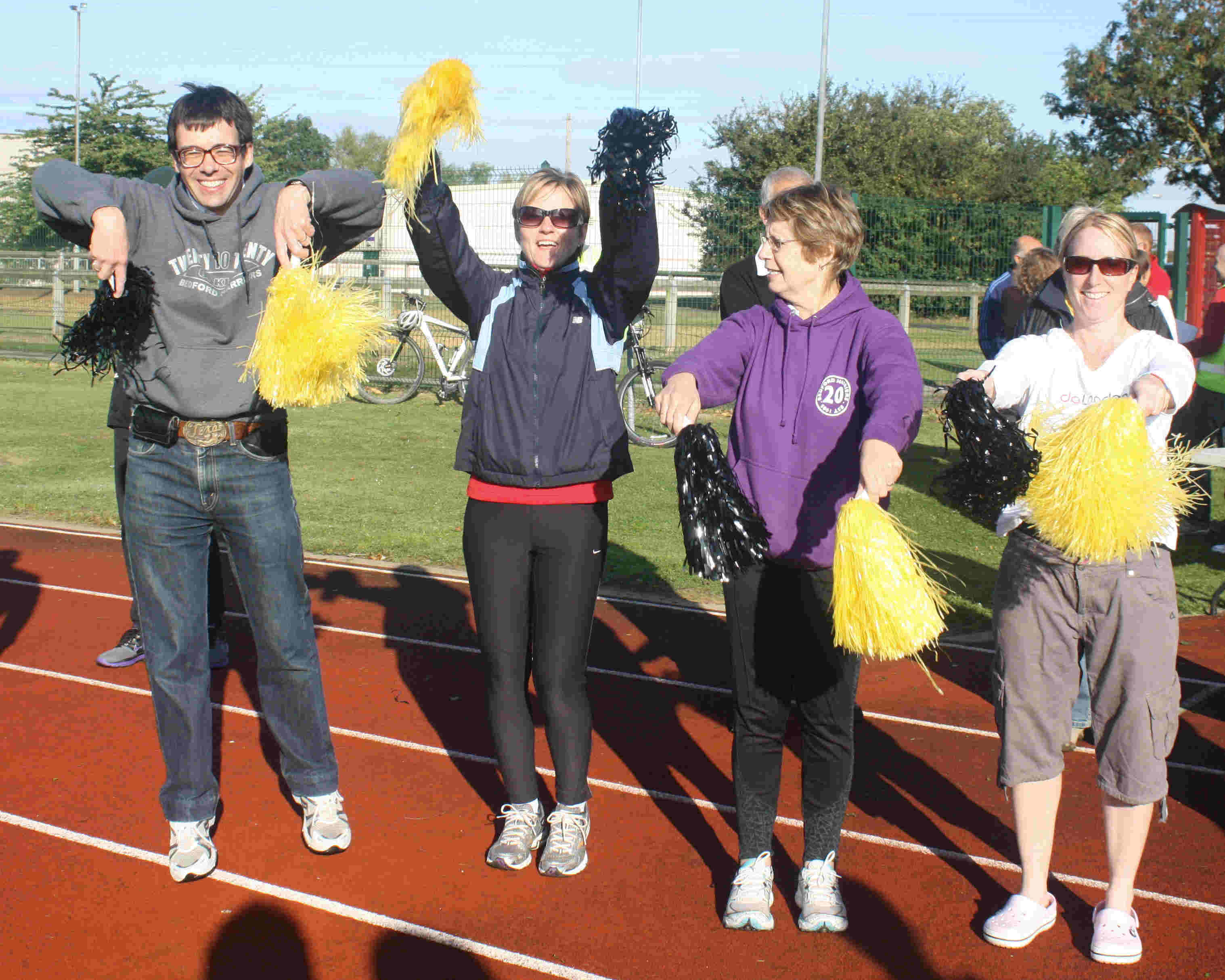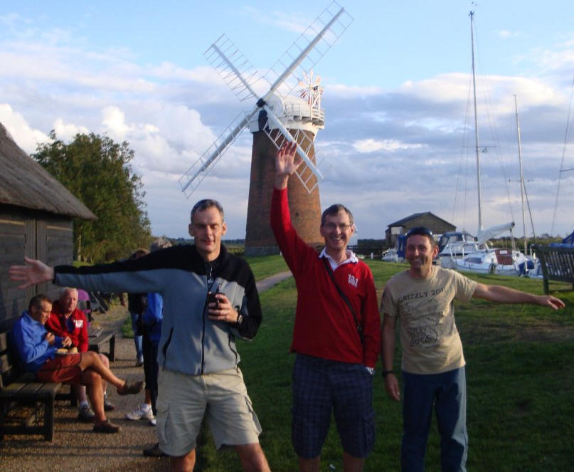 Experienced RNR runner Alex Rothwell left Kings Lynn at 6.30 am Saturday heading for Hunstanton where David Hutchings was waiting to take the baton onto Burnham Overy. Here Carl Furness took over and ran through the sand dunes and nudist beach to Wells apparently without taking in the view. Leg four saw Julie Wargent run from Wells to Cley, at this point the heavens opened but she pressed on relentlessly, a great performance. At Cley Ian Kingstone took the baton to take on the challenge of one of the toughest RNR legs, a run across shingle, sand and a hills into Cromer - appearing accompanied by another lady runner who he had spent nearly the last two hours with! Graham Short pressed on through Cromer to Mundesley tirelessly where Steve Crane was waiting to take over running his leg to Lessingham, again through rain. During his leg he was over taken by Alastair Fadden who had defected to the Colworth Striders team. This aroused some rivalry which spurred on Pete Mealing to run possessed to overtake the Striders again. The friendly rivalry between the two teams carried on throughout the event. Neil Lovesey had been waiting three hours to start his leg at Horsey but when Pete arrived at the change over point. Neil was not ready!!! But once he had the baton in his hand he put in a great run onto Great Yarmouth. Steve Daniels then picked up the baton and proceeded to run 20 miles in dwindling light a distance he agreed to run only 24 hours previously due to an injured runner having to pull out. At Bungay the baton was handed over to Bev Hayes who had the challenge of not only running for the first time in RNR but also in the dark. She did a great job, fifteen miles later at Scole she handed over to our international runner Bob Wells who flew in from France to compete in the RNR yet again. At Thetford thankfully Tony Jones picked up the baton. The complexities of the race always throws up logistical problems and this year getting Tony to Thetford proved to be complicated, however after spending all day and half the night in various cars he was ready to stretch his legs running to Feltwell where he handed the baton to four times RNR runner Kevin Willett. Wissington saw Chris Fadden take the baton knowing he had to contend with a last minute route change where a level crossing was closed. At Downham Market fresh from his marshalling duties at Great Yarmouth David Prior took the baton. After he ran a solid five mile leg he safely passed it to our last runner Angie Harris who run a 1 hour 45 minutes in a glorious September morning to the finish line where she was loudly cheered on by her fellow Harriers, and supporters including Graham Short vigorously shaking black and yellow pom poms, a sight to behold a new career for Graham?