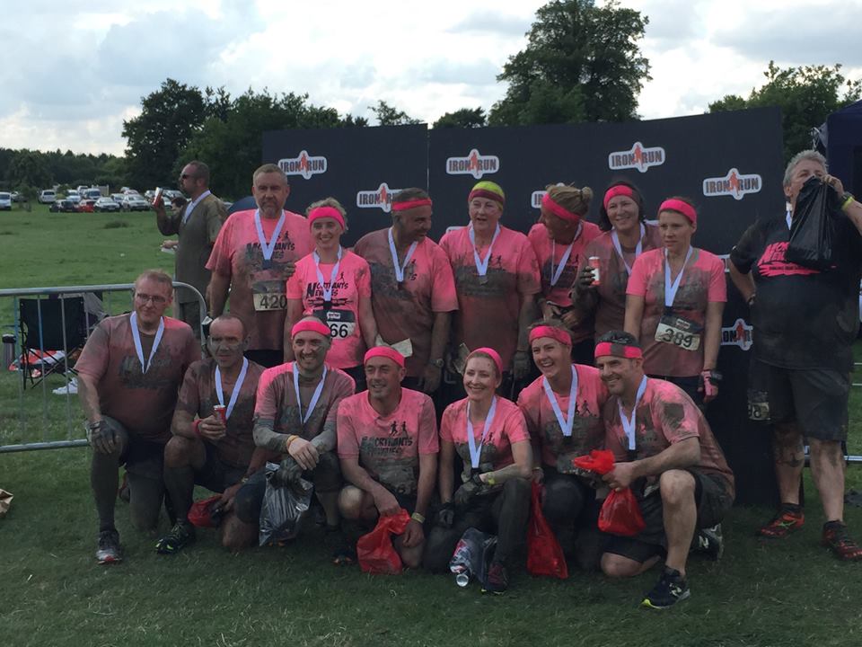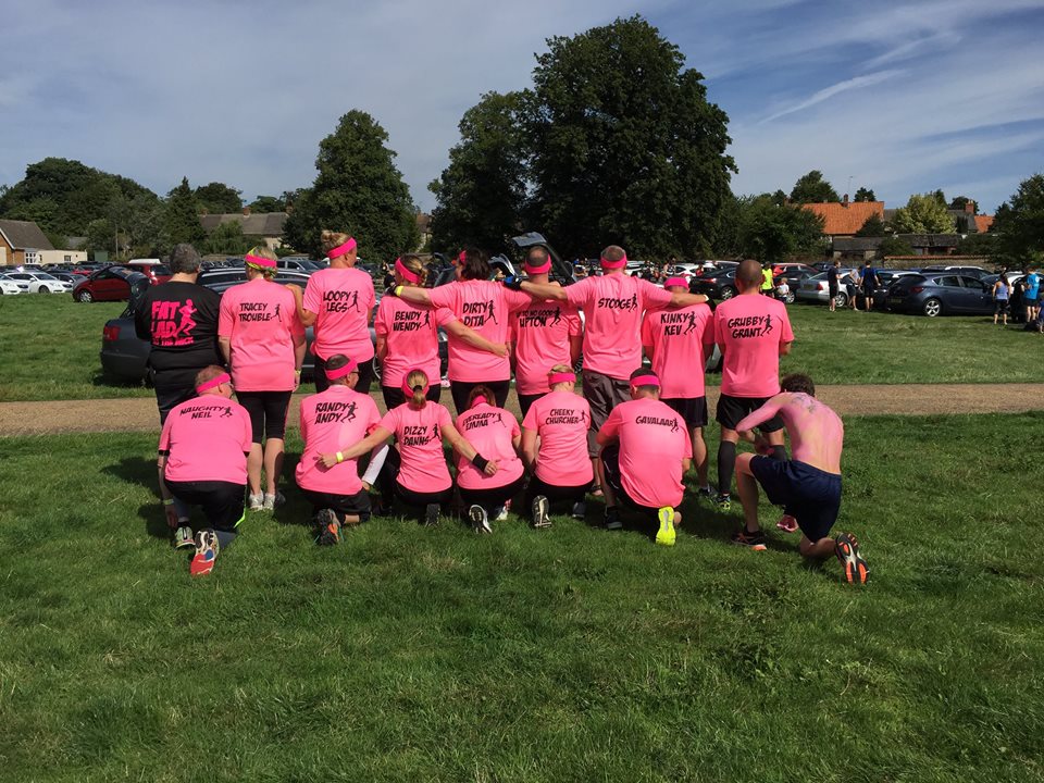 Having watched the timed wave of runners go off, it was our turn. We entered the pen, reluctantly took part in the group warm up and as soon as the warm up was over we were off. We ran round as a group to support each other round. We had about a kilometre of fields and forest running and then came out of a tricky technical forest section and then about half a kilometre of muddy track. After about 3k in we had to wade through a swamp about 2 feet deep which went on for quite some time and we worked as a group to get everyone through it. Once through the swamp and after a short fast walk/jog along a track we had to climb a steep 20 foot bank that required you to haul up a rope. Obstacles came thick and fast in between the trail sections. Some we had to clamber over - teamwork was very evident with the bigger obstacles, and then had to jump some fun fire pits and clamber in-and-out of multiple bogs. After a few more obstacles we came to a 30 feet waterslide into a bog - not good if you are wearing contact lens!! The next section was a choice - a long run round a lake, or swim right across. I chose like most of my team to swim across and the cool water was really refreshing after the heat of the day. Just when you though you were clean you then had to pull yourself up another hill by rope only go back down the other side into more muddy pits. This was about half way round the course and the rest of the course was more of the same loads of bogs, streams, inclines and the odd wooden obstacle to navigate. including one section that involved going up and down the sides of a gully about 6 times, so steep it needed ropes. The final kilometre involved a lot of time in a stream as we came back into the Cranford Hall grounds. and the final obstacle, a 6 foot wall at the finish line. As a group we were not going to be the fastest, but we started together, we finished together and we all crossed the finish line. We were caked in grey mud and smelt like ....................... but we all enjoyed it and would do it again.