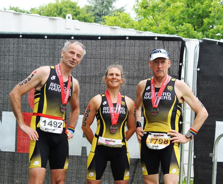 It certainly wasn’t an auspicious start for the new 70.3 in Staffordshire! Not altogether the best race preparation to be attending the Harriers’ ball on the Friday beforehand either, but some things can’t be helped. Arriving at a soggy field at 10.30am on the Saturday, having driven through pouring rain all the way didn’t put anyone in the best of spirits. The queue to get into the car parking field was slow and tedious and car parking passes were generally not where they should have been to collect. The field we parked in was an annoyingly long walk from registration, which had you snake your way through a crowded tent past all the Ironman merchandise before you even joined the queue to sign in. Queues weren’t well signed and many were waiting a long time only to arrive at the front and be told that their registration documents were at the end of another queue entirely. Tempers were fraying. My registration docs were also misplaced, briefly worrying, but eventually found. From there, there was little time to put all the correct gear in the transition bags, which need to be handed in the day before the race and prep the bike for racking. I was lucky to find shelter from the still pouring rain in the Fadden’s beautifully appointed yurt on site and organised what I needed into the relevant piles. This proved tricky, as the weather conditions were still very uncertain, so contingency clothes/sunglasses etc all had to be considered. Then the trip to the race start, about 10 miles away through built up areas with more long traffic queues, adding to frustration levels and more parking a decent walk away from swim start and transition. It’s still teeming down by the way. The poor official who tried to tell us we couldn’t get in the lake to do the practice swim when we arrived, admittedly towards the end of the time allocated, got very short shrift and his boss finally agreed that the safety team did have time for us to swim the 10 minute stretch they had arranged as a swim practice. I think the safety team may have been needed to rescue him if we hadn’t been allowed, as he was insisting we couldn’t even touch the water to check the temperature. Mercifully the swim was uneventful and the fact that there was a changing room and warm showers at the end was a most unexpected pleasure. Lucky for us that we had trusty companions in the form of Sarah and Billy Fadden who had realised that we were not going to exit the water at the same place we entered it and brought our bikes and dry kit around the lake to us – others were traipsing back around the lake path, cold and wet in bare feet. It’s still pouring at this stage! At least changed into dry clothes, we went to rack the bikes and where queues had been developing to get into transition, for us this was fairly quick and painless. Bikes smothered in large plastic bags, timing chip collected, blue bag for bike kit hung on the correct peg, we set off on the walk back to the car, now with soaking feet where the drenched grass transition area was rapidly sinking under growing puddles. Quick stop at Tesco café to warm up and eat something before heading back to registration area to drop off our run bags, briefly run through the geography of the second transition area and then attend the 5pm race briefing. This was less informative than usual, but at least in the dry; it was hard not to snooze through this. Another walk, this time a pretty track to the local pub, which was lively, but happily found room to seat and feed us. The walk back was still in the rain, but much better on a well fed stomach. Final prep for the morning, alarms set, swim gear organised, wet-suits drying, tri kit ready. How wonderful to snuggle down in a proper (albeit bunk) bed in a snug and truly waterproof yurt with a proper floor and log burner making ‘camping’ a truly comfortable affair. Best night’s sleep I’ve had before a race for a long time! But in the morning, despite the fact that it has finally stopped raining, all is not well. In plenty of time for our bus, we walked over the brow of the hill to see a queue of people several miles long, all waiting for the same bus, which has obviously not arrived. They are meant to be frequent and ferry us to the race start, but it is soon apparent that if we join the queue we will certainly miss transition and probably the race start. Sarah to the rescue once again, who is tactfully roused from her slumbers by Alastair to ferry us and a couple of random other competitors found heading for the bus, to swim start. We arrive with 8 minutes of official transition open time left and hastily check tyres, gears, shoes, garmin, food, bottles, etc. The large number of plastic coated bikes still on the racks show that a significant proportion of athletes have not yet made it! Transition closing is postponed and eventually the race start is pushed back, but only by 10 minutes. We have time to watch the pros set off on their swim and for those of us in later waves, to see them come in again and leave on their bikes. Waiting in wetsuits, the sun is even starting to break through the clouds! And just when we thought we had another 10 minutes, they have caught up on the 10 minute start delay and we are being called to the pen. Our ladies wave included Tania Ramsay (wife of Gordon, who was also racing), but I can’t say I spotted her. Pink swim hats again, such a cliché. The pontoon lets us down into the water gently and it’s not warm, but to be fair it’s not instantly freezing either, however as I hang about on the front line of the swim, rapidly cooling off and starting to shiver, with no-one wanting to be in front of me, I realise it’s going to be a slow swim today. I never lead out the swim, but at Staffs I did. Assuming hoardes of quicker swimmers would soon overtake me and I would latch onto some helpful feet, I set off as usual. There really weren’t many quicker feet, however and finding a decent draft 