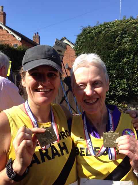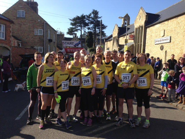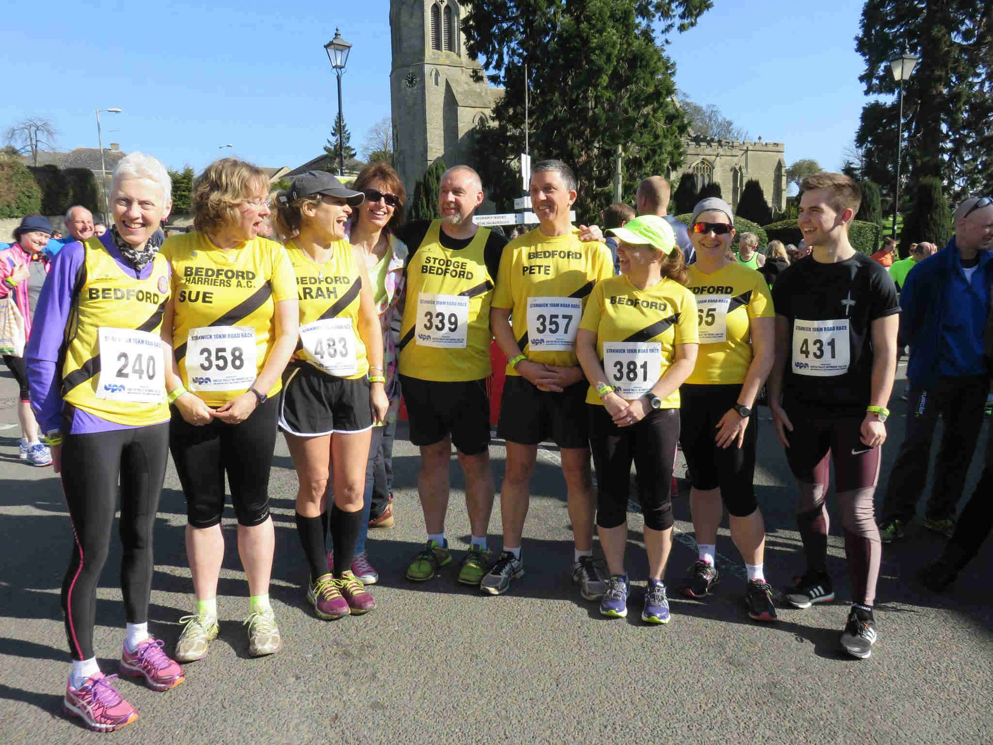 An extra couple of days over the weekend deserves and extra race doesn't it? that's what logic says. I'd heard about Stanwick before, but never run it so was excited to do a new one. Right from the start I planned to not go too hard, still a little muscle soreness from Saturdays marathon meant I probably couldn't if I'd tried! We arrived in good time and guess what? Registration was only in the pub!! Fantastic, very well organised systems meant we had our numbers very quickly and were soon outside lapping up the sunshine and chatting to friends. More Harriers arrived so I turned into a mother hen and began to try to herd them all together for a photo, I didn't do too bad but didn't capture everyone (thanks Renette for being photographer) the village centre was the church and the pub, with the start/finish line also right there in the road it was quite a spectacle. Lots of locals, families and friends were gathered in the spring sunshine as we took off. The first 3 km hurt a bit but as I warmed up it got easier. So nice to run in the sunshine and not have lots of layers on. The route was quite undulating and a good km was on a main road where we were coned off. The rest was glorious scenery and lots of lovely support. I missed the 5 and 6km markers - must have been talking. At 7km I managed to overtake a couple of people which was brilliant, if unusual. Soon we hit 9 and I tried to put my toe down a bit, the last km was a bit twisty and sloping and you ran finally down a gentle hill into the heart of the village where - if you were lucky they called out your name as you crossed the finish line. A man with a laptop read out your time (52.59) and then further down the funnel the mayoress (I think) handed me my medal. I did say I preferred hers, it was massive and golden but she told me I'd have to do much more than a 10k race to get one of those! There were bacon rolls somewhere and other delights but I needed to get back to Bedford so didn't hang about. Lovely to see a great turnout of fellow Harriers! Am pretty pleased with this and would definitely do it again. Not a PB race but this little English village with it's tall spired church nestled in the Northamptonshire countryside oozes beauty and charm. Keep running Sarah |