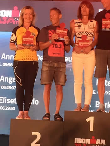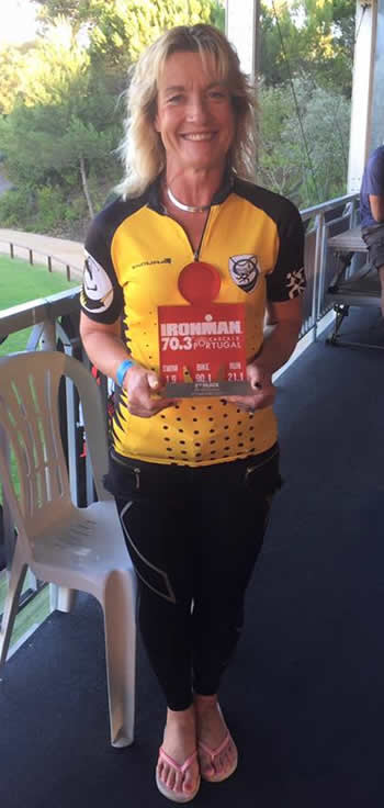 IRONMAN 70.3 Cascais in Portugal is an amazing race. 4 of us arrived to the Portuguese heat and sunshine, checked into our apartment and then off to register. It was a 500m walk downhill to the very pretty town centre with some cobbled paths and roads. The beach was full of sunbathers but not many in the cool Atlantic sea. Registration done, more back packs to add to our collection and then into the merchandise shop and of course a few purchases. We found a small supermarket to get supplies for race day breakfast, chocolate milk and water. Lunch was the local grilled sardines and a few beers. Back to building bikes and then off to the pasta party. Sacha and I were in our dresses and it started to get windy on our walk there and it continued to get worse and much colder. It is such an emotional moment when the music starts and the video presentation begins, you are drawn into the world of IronMan - this is what we have trained for! On Saturday we went out on our bikes to see if we could find the course and its hills, we found some but actually went up the race course descent. Off to the English briefing and left Sacha on the beach. We all took note of the ups and downs, how to enter the F1 race track and save our legs on the first part for the hills that follow. They did forget to say that the run was hilly too!! We were told that we could not rack our bikes on Saturday as they were expecting more winds coming in and didn't want us to worry about our bikes. We met Sacha on the beach for a swim in the sea and managed to swim round a boat without it being too cold. Race day morning up in the dark, breakfast and then bikes and bags ready for the off. Walking to the start was quiet and all thinking about our race plans. We had quite a long wait after racking and it was cool, wet suits on and the sun was rising giving everywhere a warm glow. On the beach into out time pens - BANG - a canon went off for the start of the pro men then again for ladies and another for us lot. Great start, 4 athletes every 5 secs, very safe, not scary, no washing machine effect just similar swimmers around you. We did an Australian exit on the next beach, back into a choppier sea and the exit was rather slippery up the slipway but lots of helpers. A very long transition, didn't help that I went the wrong way! Out on the bike ride, a bit cool but soon warmed up on the 'flat' part out to Lisbon, saw their Golden Gate Bridge. It was great fun going round the F1 course and then onto the hills - hills and wind - but what an amazing course, never a dull moment. At the top of the biggest climb there were loads of cyclist cheering us on our way, great support for us having ascended 600+ metres. Then the best bit a long steady descent back into Cascais along the coastal road, great waves and views and a big thank you to the crews who had been out sweeping the sand off the road. Shoes on and the only the run to do 13.1. Straight into a feed station, very welcome, down the hill and through the town centre with lots of supporters and cheers, up and out, up and round, up and down, get the picture, only 200 metres of climbing! Great run course with showers, feed stations and young lads ready to soak you in water as temperatures had soared to 30+. It was also great to see Gary and Mark on the course, last 5 miles were pure effort from me and all worth it for 2nd place in my age cat! We all would definitely go back and do this race again maybe it will go full distance in a few years?! |